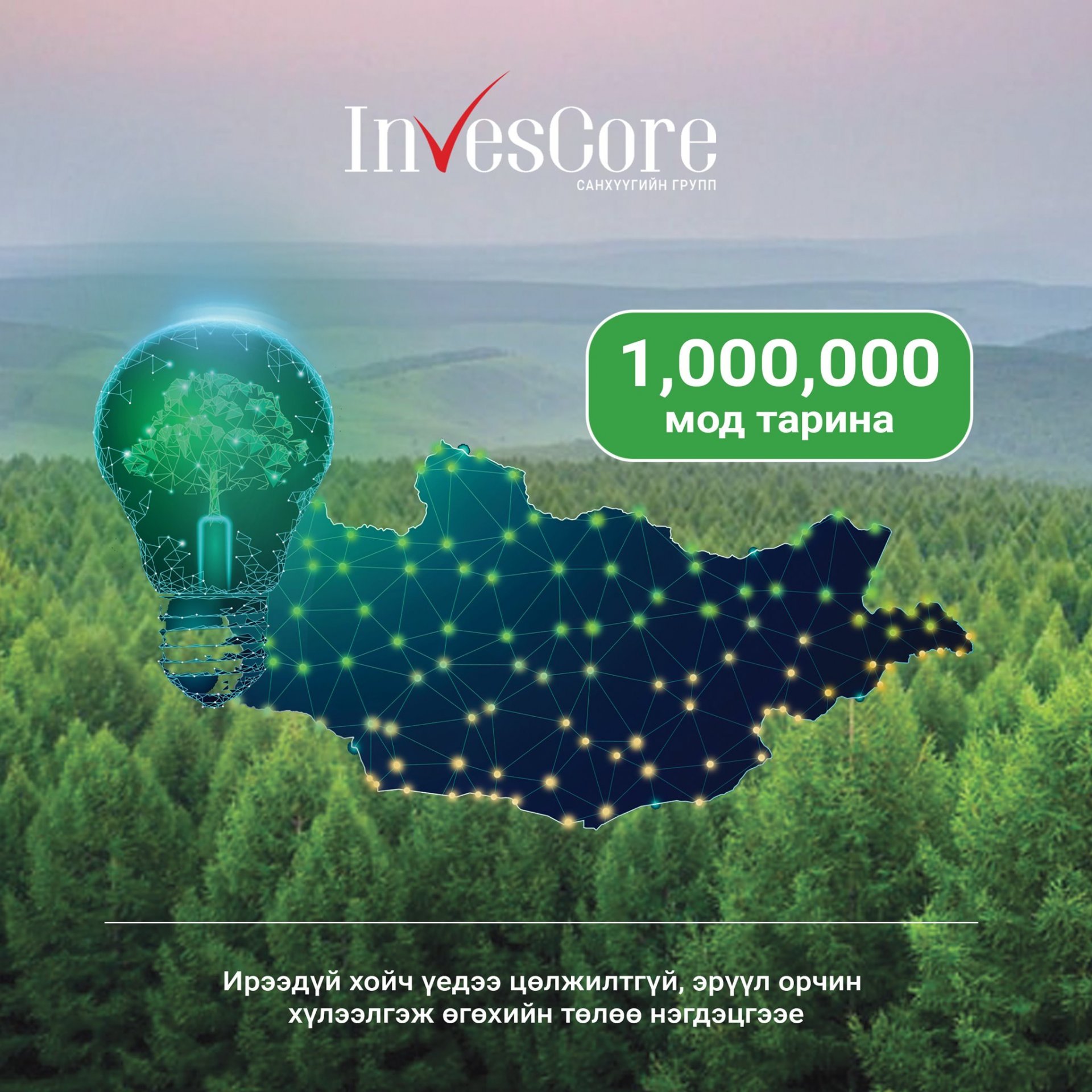 Инвескор санхүүгийн групп нь Монгол Улсын Ерөнхийлөгчийн санаачлагыг дэмжиж, 2030 он хүртэл 1,000,000 ширхэг мод ургуулж, хувь нэмрээ оруулах болно.