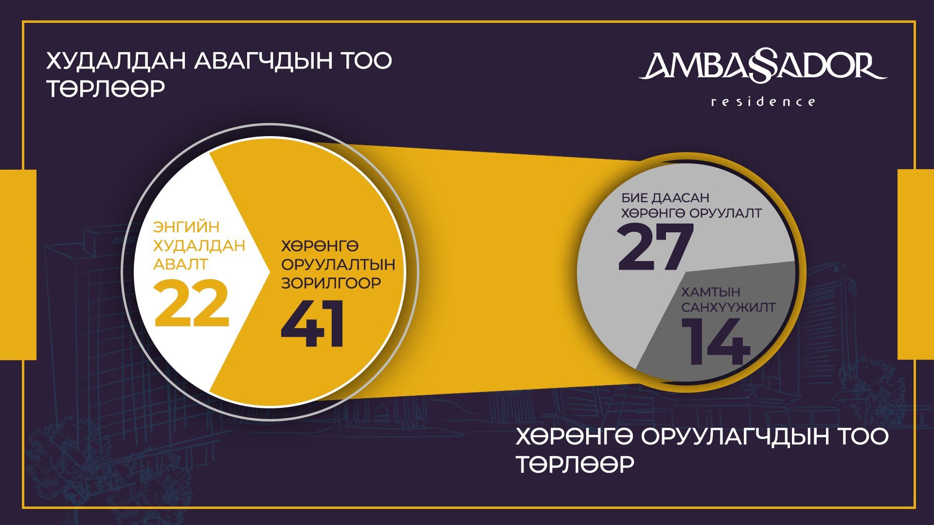 Банкуудын төгрөгийн хадгаламжийн жилийн хүү дунджаар 9%, ам.долларын хадгаламжийн жилийн хүү дунджаар 2% орчим байгаа энэ үед эрсдэлээс зайлсхийх хандлагатай хөрөнгө оруулагчдын хувьд хамгийн оновчтой сонголт бол үнэ цэнээ хадгалаад зогсохгүй цаашид зах зээлийн үнэ нь өссөөр байх, тогтмол орлого үүсгэх үл хөдлөх хөрөнгө юм.